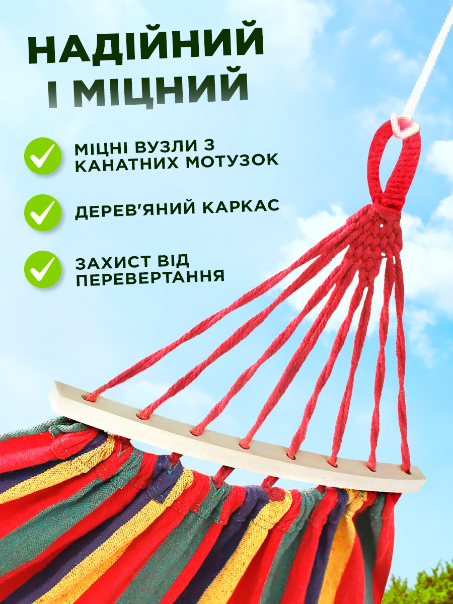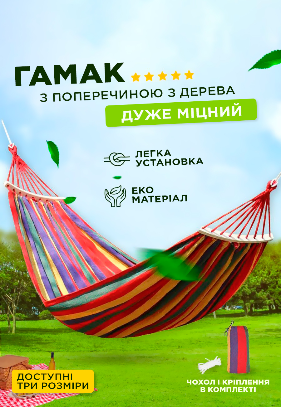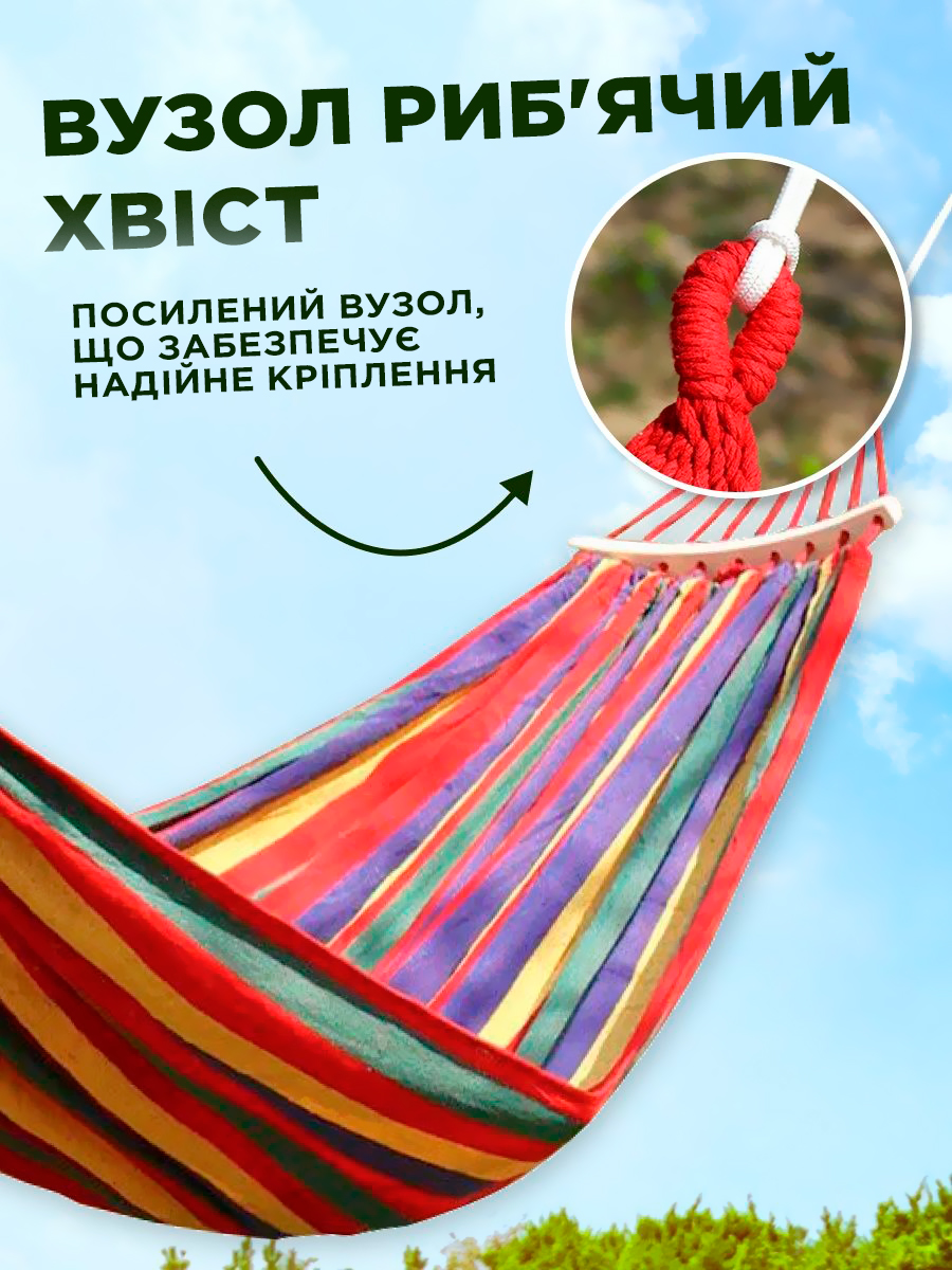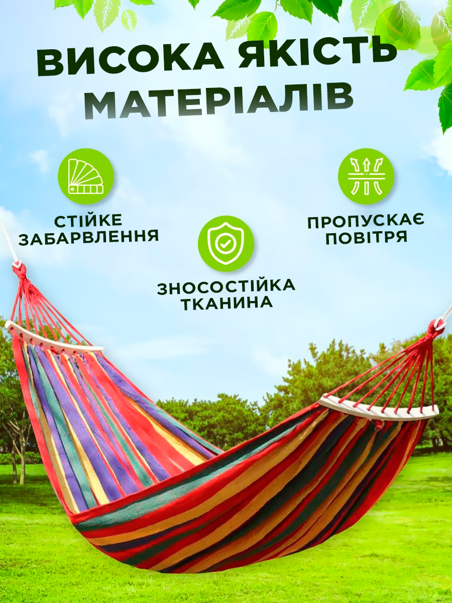 Підвісний гамак - гарантія чудового відпочинку на свіжому повітрі! А яскраве забарвлення підніме настрій в будь-яку погоду. Тканинний гамак для дачі та саду надійний і довговічний у використанні, не рветься і витримує велике навантаження.